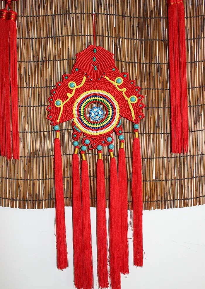 首先要選定編結(jié)材料,設(shè)計(jì)好色彩方案,用的線材可以是多種,根據(jù)需要進(jìn)行顏色搭配。編完之后,要將結(jié)子抽緊定形,這是整個(gè)編結(jié)過程中最重要也最考驗(yàn)技術(shù)的步驟。繩結(jié)在編好、抽好之后,修的工夫也不能馬虎,而注重細(xì)節(jié)。