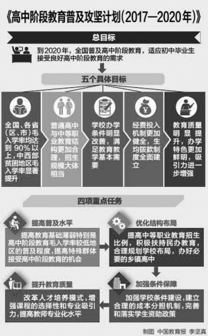 據(jù)中國民族報訊 2017年4月6日,教育部公布《高中階段教育普及攻堅計劃(2017-2020年)》(以下簡稱《攻堅計劃》)?!豆杂媱潯诽岢?,到2020年,全國普及高中階段教育。我國高中階段教育毛入學(xué)率將要達(dá)到90%。