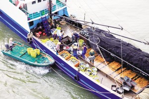 小快船靠上捕魚歸來的大漁船,收購、轉(zhuǎn)運海鮮漁獲(2014年攝)。