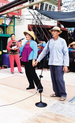 三亞疍歌傳承人代表張發(fā)結(jié)(右)在漁船上演唱疍歌(2014年攝)。