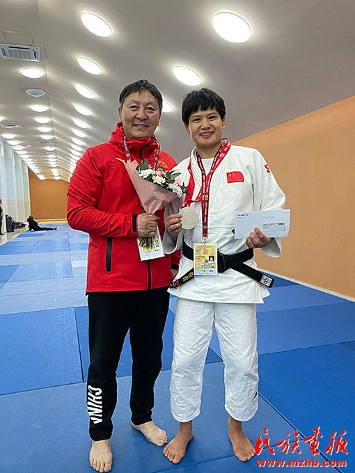 烏日根桑格(左)隨國(guó)家柔道隊(duì)參加 2021年世界柔道大滿(mǎn)貫比賽。圖為與國(guó)際級(jí)運(yùn)動(dòng)健將、國(guó)家柔道隊(duì)隊(duì)員楊俊霞合影留念。