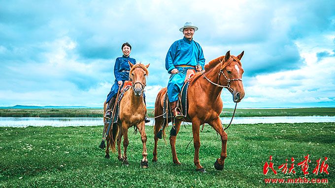 烏日根桑格與愛(ài)人薩日娜在牧區(qū)。