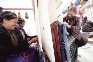 山南市瓊結(jié)縣農(nóng)牧民在襄陽援藏工作隊引進的西藏薩喜欽布公司編織藏毯。 湖北省民宗委供圖