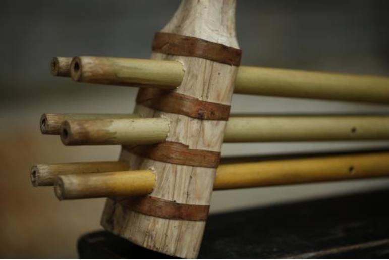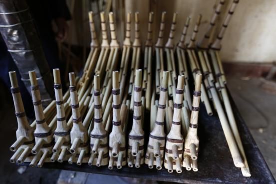 制作:蘆笙管用當(dāng)?shù)胤Q蘆笙竹的竹子制作而成,管的兩端直通(有的地區(qū)蘆笙是上通下不通),按孔為方形(有的地區(qū)為圓形),簧片制作與其他地區(qū)蘆笙一樣;共六組合,用花果樹皮作兩道箍。