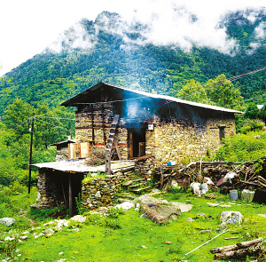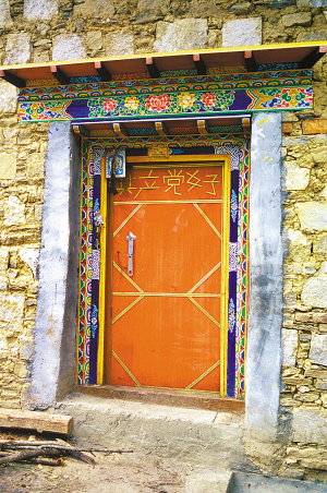 房屋大都是3層,上層存放干草和秸桿,下層關養(yǎng)牲畜,中間一層是居室。居室用木板隔間,里間較小是已婚子女住的,外間寬敞,是多功能堂屋。臨窗處設火塘,以利排煙,是家庭生活中心和待客之處?;鹛辽霞苤T大的鐵三角架,上面是六七厘米寬的鐵板圈,擦得錚亮,能烤制食物。墻角處供奉佛像,擺放領袖像。房門安設木鎖,用十幾厘米的木鑰匙開啟,都是由硬木刻制,光滑耐用。